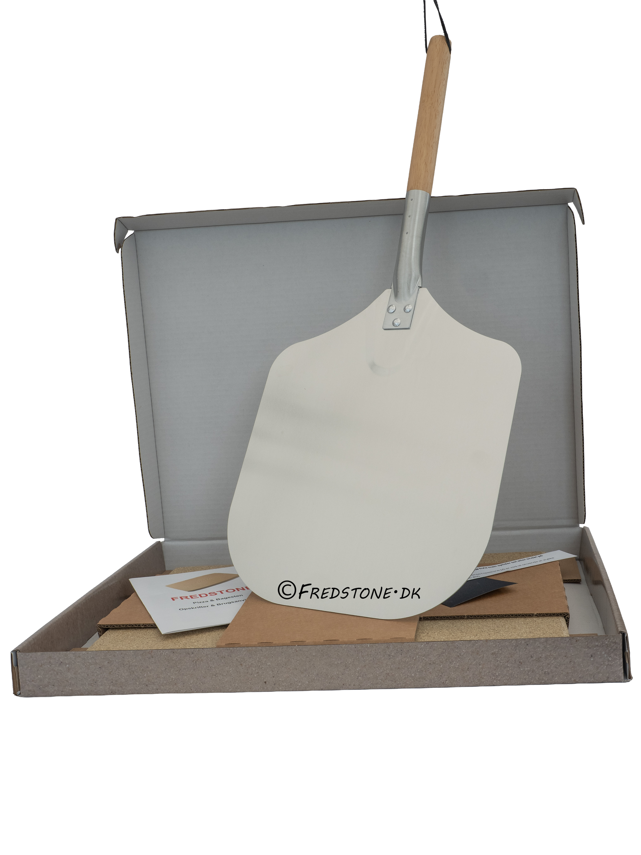 Pizzakit: Fredstone pizzasten 44,5 x 30,5 x 1,6 cm. og aluminiums pizzaspade med træhåndtag